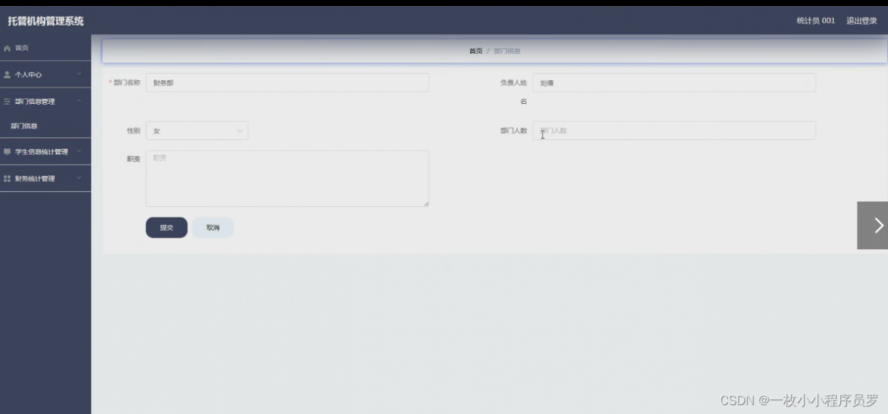 7.统计员,统计员可以对部门信息管理、学生信息统计管理、财务统计管理进行添加、修改、删除等等操作。