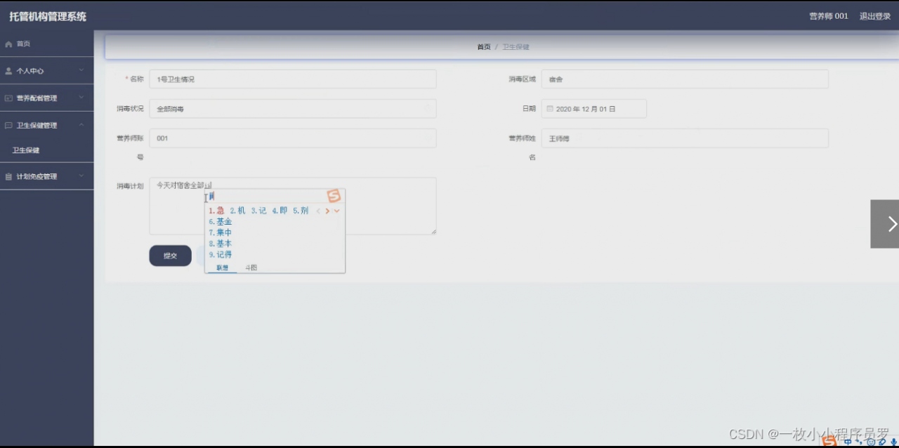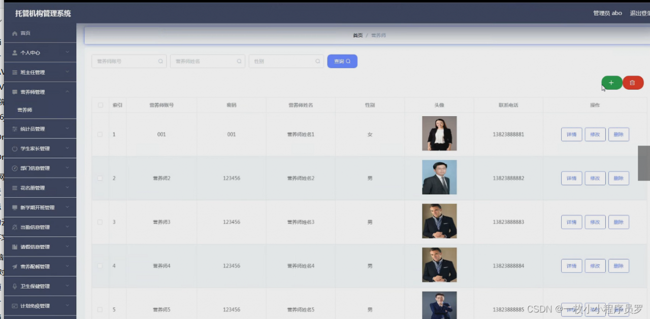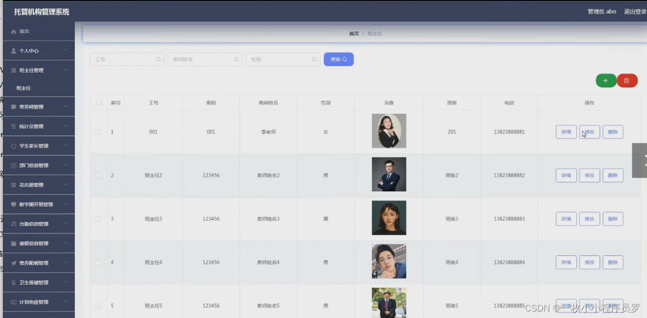 网上托管机构管理系统从本质上讲是一个电子商务模式综合而成的系统。实现了首页、个人中心、班主任管理、营养师管理、统计员管理、学生家长管理、部门信息管理、花名册管理、新学期开班管理、出勤信息管理、请假信息管理、营养配餐管理、卫生保健管理、计划免疫管理、学生信息统计管理、财务统计管理等基本功能。