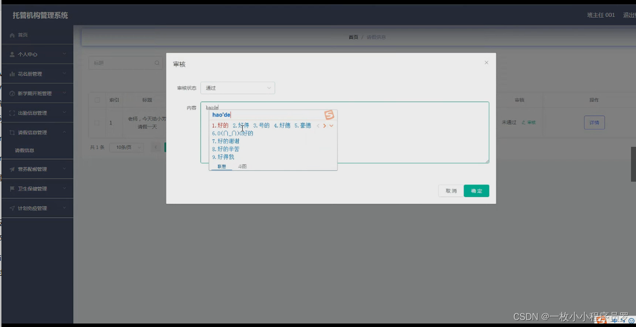 5.请假信息,学生家长可以在线为学生请假,班主任进行审核查看回复