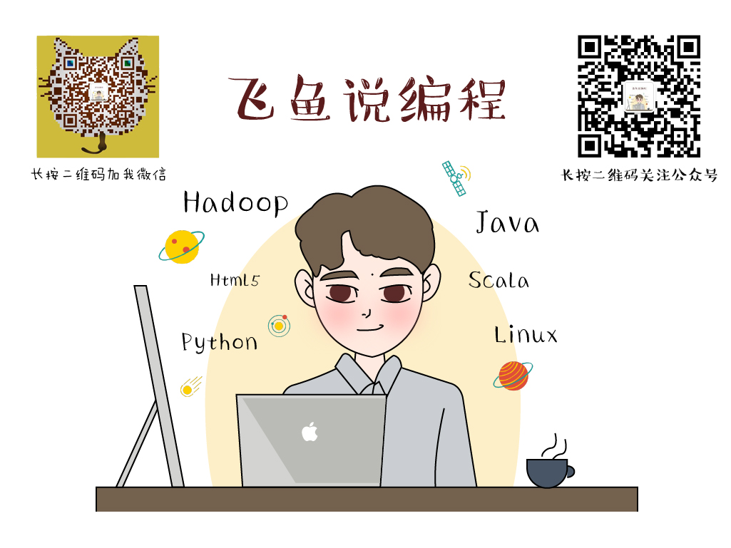 想了解飞鱼说编程的最新动态可以关注公众号:飞鱼说编程(id:feiyucoding),如有任何问题和建议也可以加我的个人wechat(id:feiyucoder),同样欢迎加入我们的社群(QQ群:796284029,wechat群需要加我个人wechat后,我再邀请入群,因为人数已经超过100人,无法扫码入群!)。