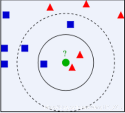 根据上图所示,有两类不同的样本数据,分别⽤蓝色的小正方形和红色的小三角形表示,而图正中间的那个绿⾊的圆所标示的数据则是待分类的数据。也就是说,现在,我们不知道中间那个绿色的数据是从属于哪⼀类(蓝色小正方形或者红色小三角形),下面,我们就要解决这个问题:给这个绿色的圆分类。