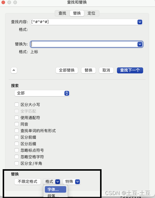 - 替换为:格式-上标,具体是最下方替换下面的-格式-字体-上标