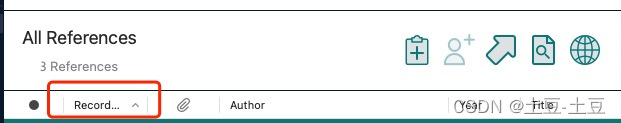3)这时在endnote中,应该就有所有的参考文献了,而且加入的顺序和原本参考文献的顺序一致。默认是按作者名排序的,我们右键红框这一栏,给“record number”打上勾,让文献按照加入的顺序排序。