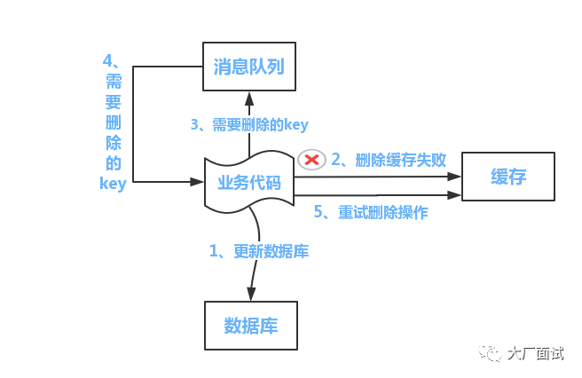 3.删除缓存失败时,将删除的key放到内存队列或者是消息队列中进行异步重试