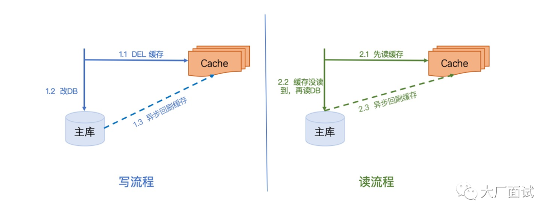 2.异步删除缓存(如果数据库是读写分离的,那么删除缓存时需要延迟删除,否则可能会在删除缓存时,从库还没有收到更新后的数据,其他读请求就去从库读到旧数据然后设置到缓存中。)
