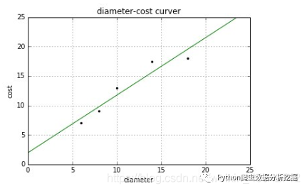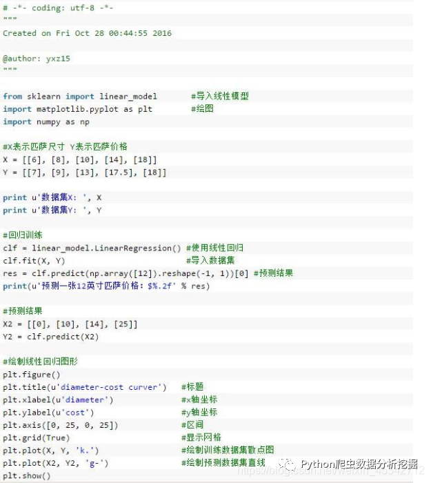 运行结果如下所示,首先输出数据集,同时调用sklearn包中的LinearRegression()回归函数,fit(X, Y)载入数据集进行训练,然后通过predict()预测数据12尺寸的匹萨价格,最后定义X2数组,预测它的价格。