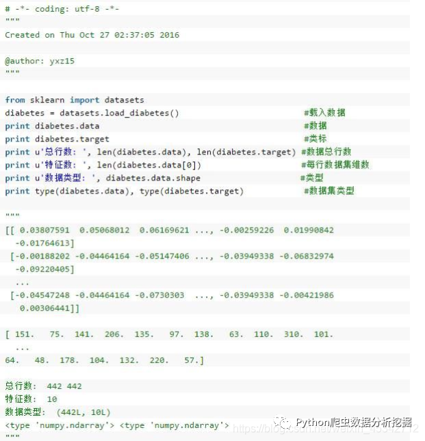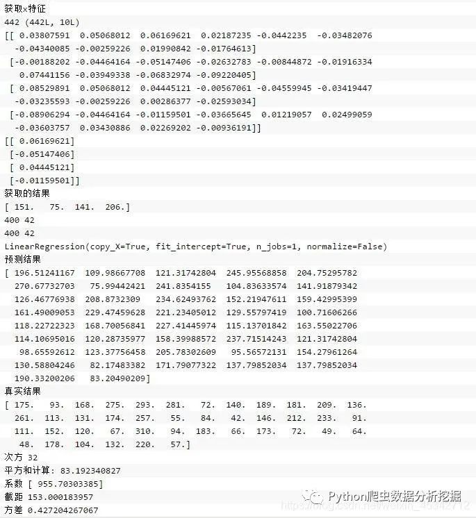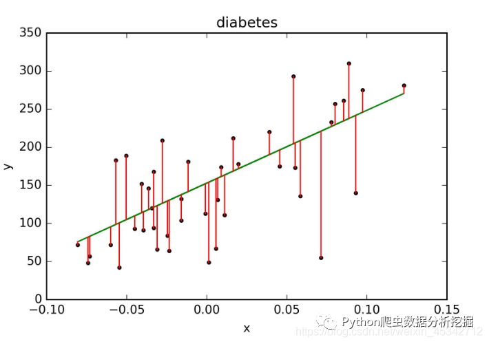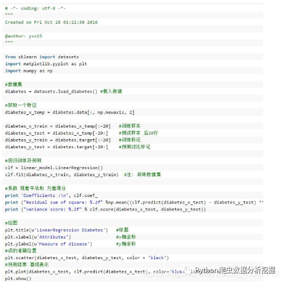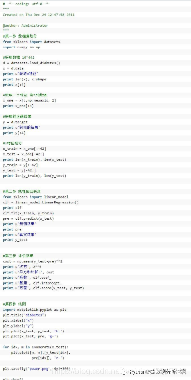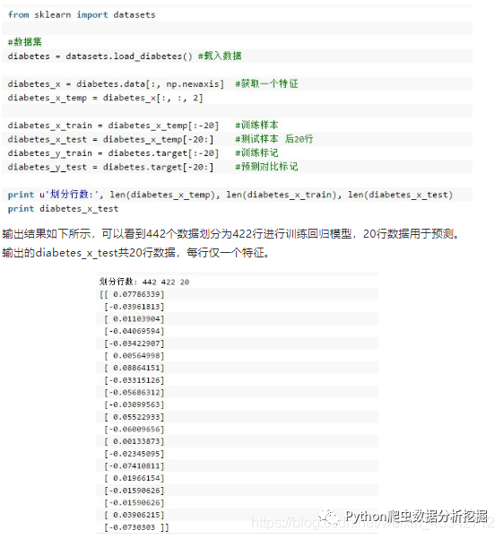 然后载入数据,同时将diabetes糖尿病数据集分为测试数据和训练数据,其中测试数据为最后20行,训练数据从0到-20行(不包含最后20行),即diabetes.data[:-20]。