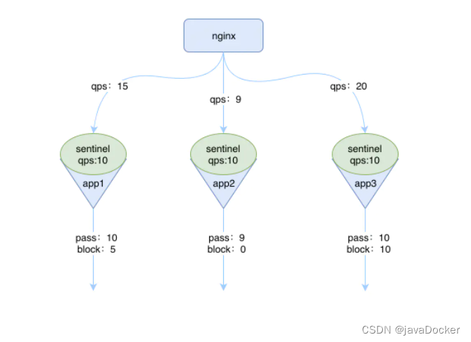 假设我们设置了一个流控规则,qps是10,那么就会出现如上图所示的情况,当qps大于10时,实例中的 sentinel 就开始生效了,就会将超过阈值的请求 block 掉。