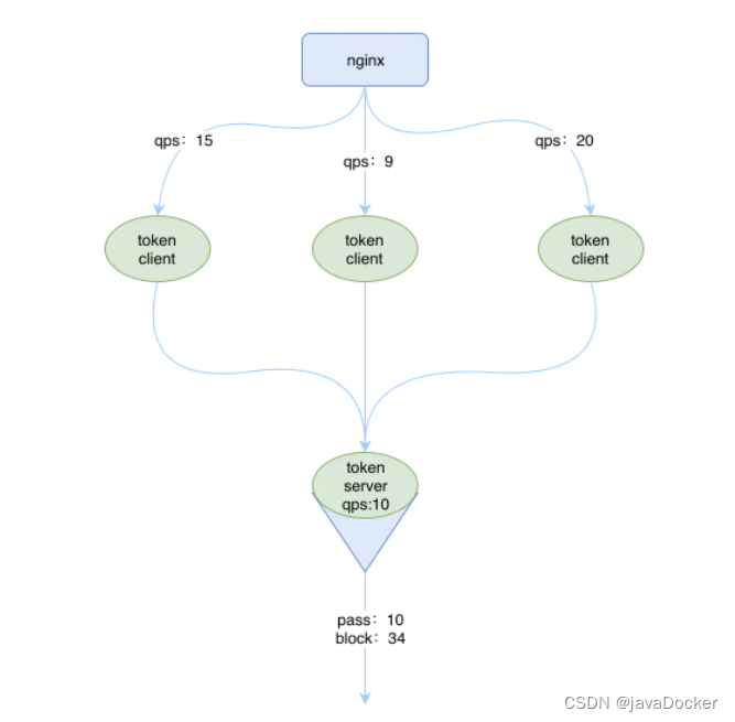 这个专门的用来统计数据的称为 Sentinel 的 token server,其他的实例作为 Sentinel 的 token client 会向 token server 去请求 token,如果能获取到 token,则说明当前的 qps 还未达到总的阈值,否则就说明已经达到集群的总阈值,当前实例需要被 block,如下图所示: