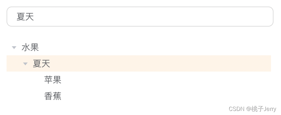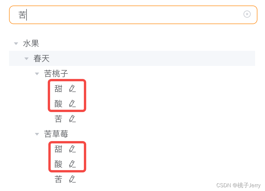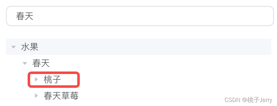 当搜索 “春天” 的时候,父子级都能匹配到,这个时候子级的支线节点 “桃子” 也会显示出来: