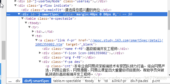 就比如在第一篇文章中爬取的网易云课堂计算机专业大学课程中,如果我们进一步爬取计算机专业可以就业的岗位信息时,通过开发者工具,我们发现,我们所需要的数据位于id="j-smartSpec" 的div中,