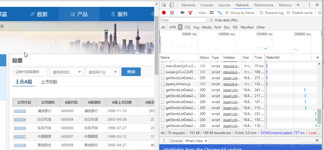 如图,在开发者工具Network中的JS中分析,如果感觉实在太多文件不好分析,那么我们发现上面有上市A股点击会小范围刷新的现象,最终可以完全明确目标