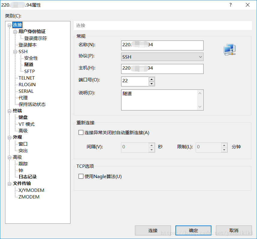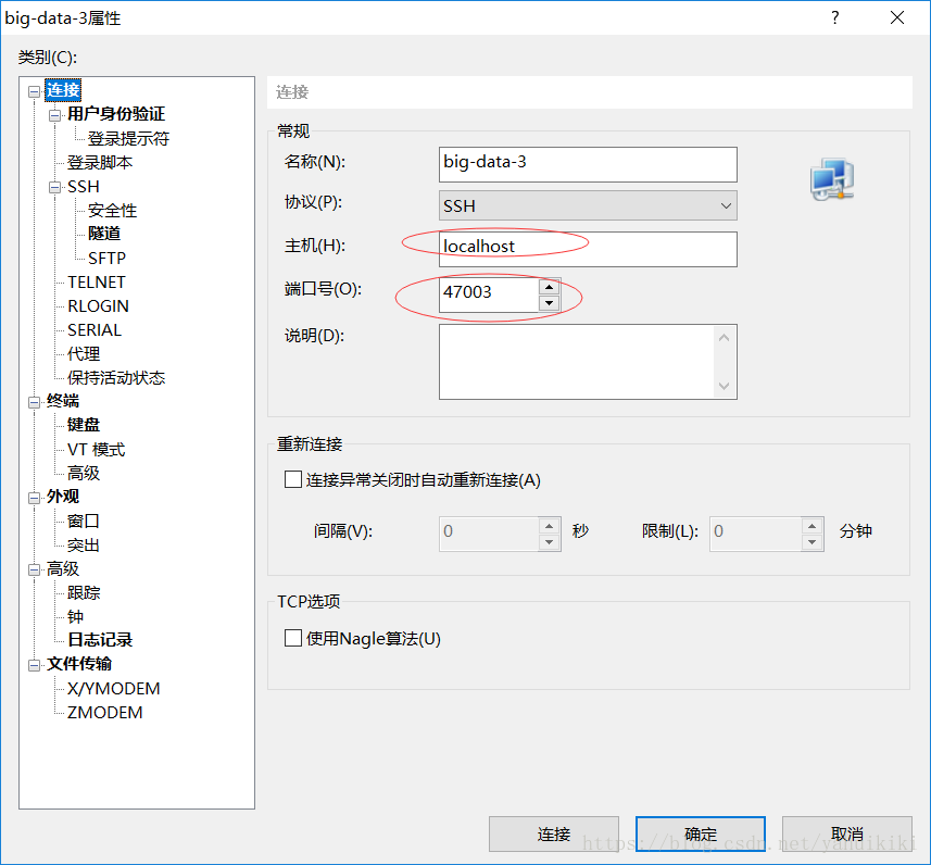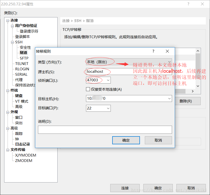 此时,打开一个新的窗口来连接需要被访问的内网主机。上一步配置的隧道端口47003,于是连接信息如下: