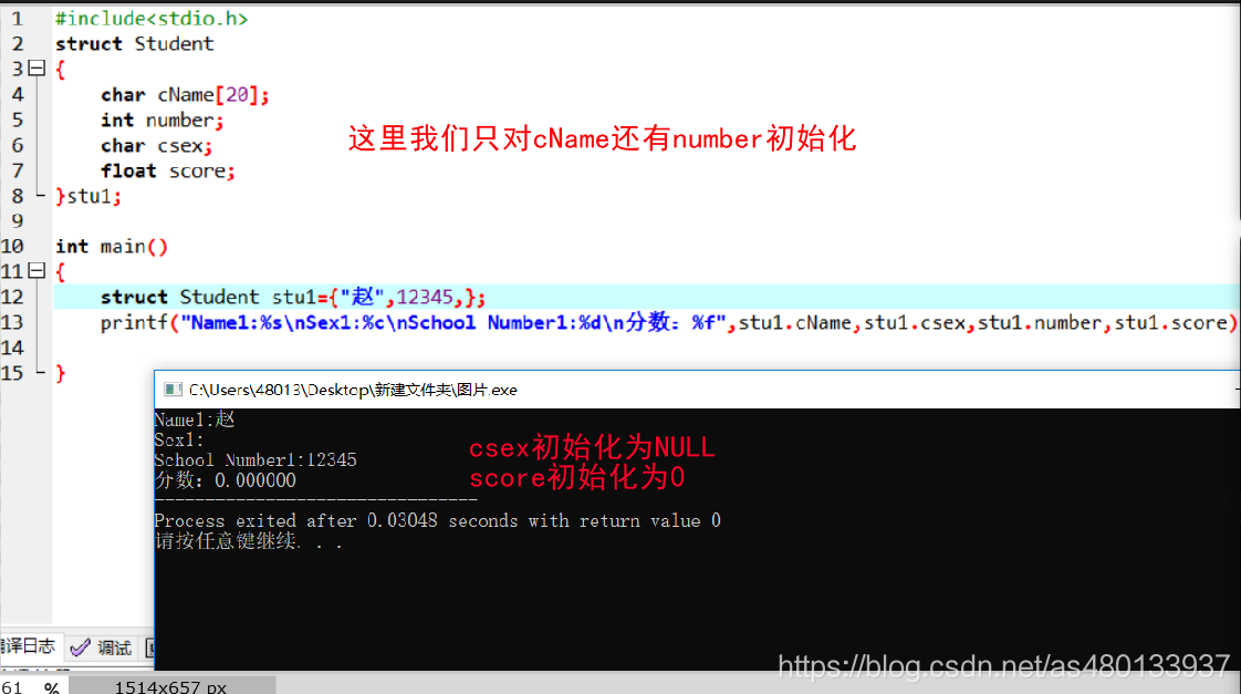 ps:在对结构体变量初始化时,要对结构体成员一一赋值,不能跳过前面成员变量,而直接给后面成员赋初值,但是可以只赋值前面几个,对与后面未赋值的变量,如果是数值型,则会自动赋值为0,对于字符型,会自动赋初值为NULL,即‘\0’