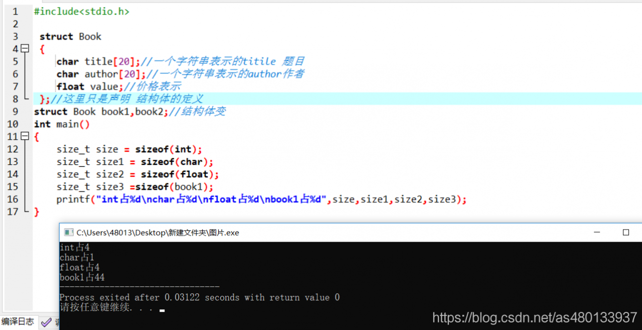 定义结构体变量以后,系统就会为其分配内存单元,比如book1和book2在内存中占44个字节(20+20+4)具体的长度你可以在你的编译器中使用sizeof关键字分别求出来。