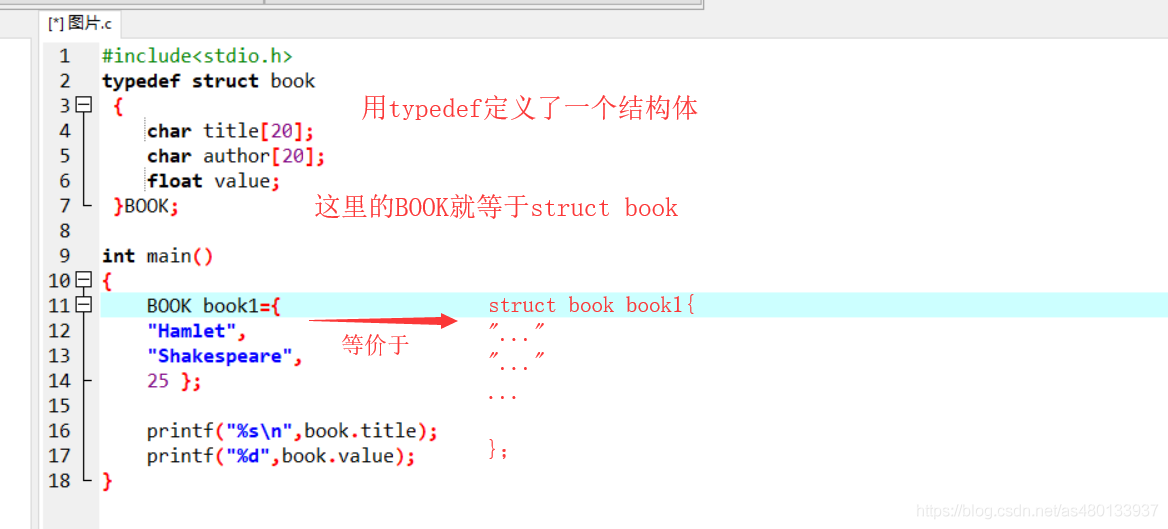 这里的BOOK就相当于struct book的一个别名一样,用它来定义结构体变量非常简便
