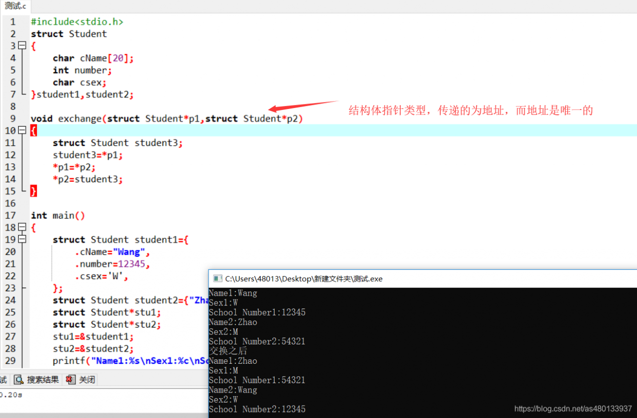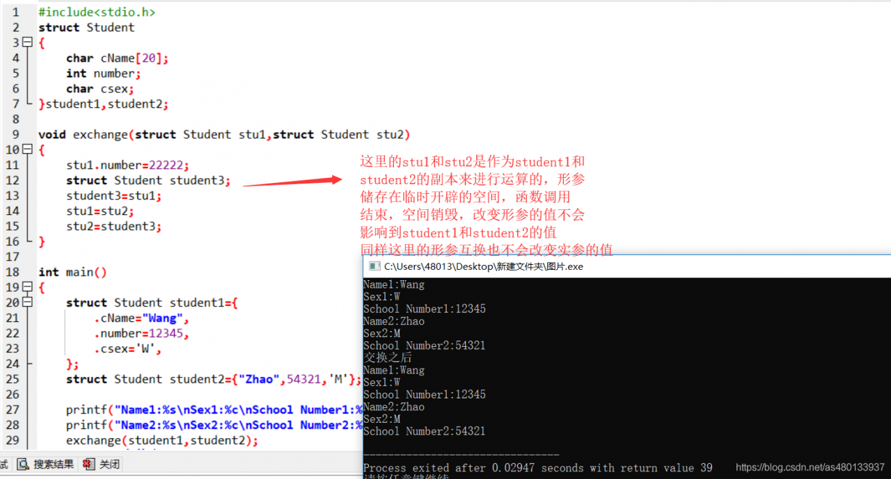 首先我们要注意的一点,使用结构体变量作为函数参数的时候,采取的是值传递的方式,将结构体所占内存单元的内容全部传递给形参,并且形参必须也要是同类型的结构体变量,在使用时,会自动创建一个结构体变量作为原变量的副本,并且也需要占内存,并且在调用期间如果修改(形参)结构体中成员的值,修改值是无效的,
