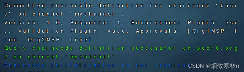 ./network.sh deployCC -ccn basic -ccp ../asset-transfer-basic/chaincode-go -ccl goccn代表链码名称,ccp代表链码路径,ccl代表链码的编程语言。