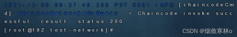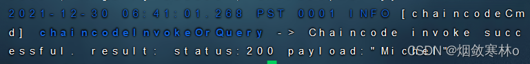 peer chaincode invoke -o localhost:7050 --ordererTLSHostnameOverride orderer.example.com --tls --cafile "${PWD}/organizations/ordererOrganizations/example.com/orderers/orderer.example.com/msp/tlscacerts/tlsca.example.com-cert.pem" -C mychannel -n basic --peerAddresses localhost:7051 --tlsRootCertFiles "${PWD}/organizations/peerOrganizations/org1.example.com/peers/peer0.org1.example.com/tls/ca.crt" --peerAddresses localhost:9051 --tlsRootCertFiles "${PWD}/organizations/peerOrganizations/org2.example.com/peers/peer0.org2.example.com/tls/ca.crt" -c '{"function":"TransferAsset","Args":["asset6","Christopher"]}'成功后如图: