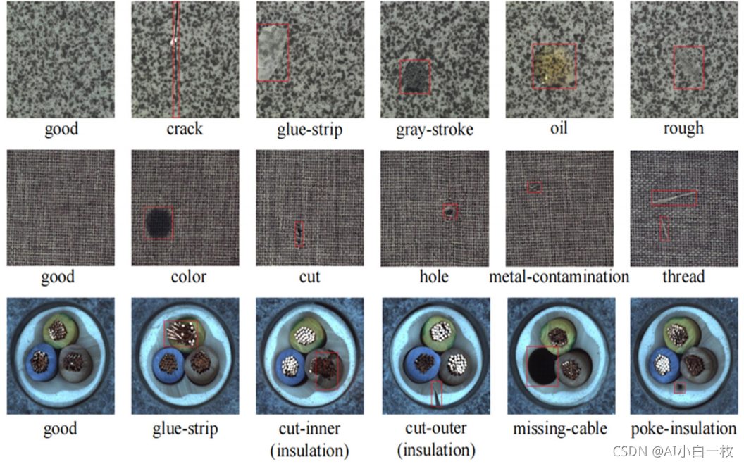 MVTec AD 数据集共包含 15 个类别,其中 5 个类别为不同类型的纹理,其余 10 个类别为 10 个不同类型的对象。 在这个数据集中,3629幅图像用于训练和验证,1725幅图像用于测试。 训练集仅包含无缺陷图像,而测试集包含无缺陷图像和各种类型的缺陷图像。 该数据集通常用于无监督缺陷/异常检测。