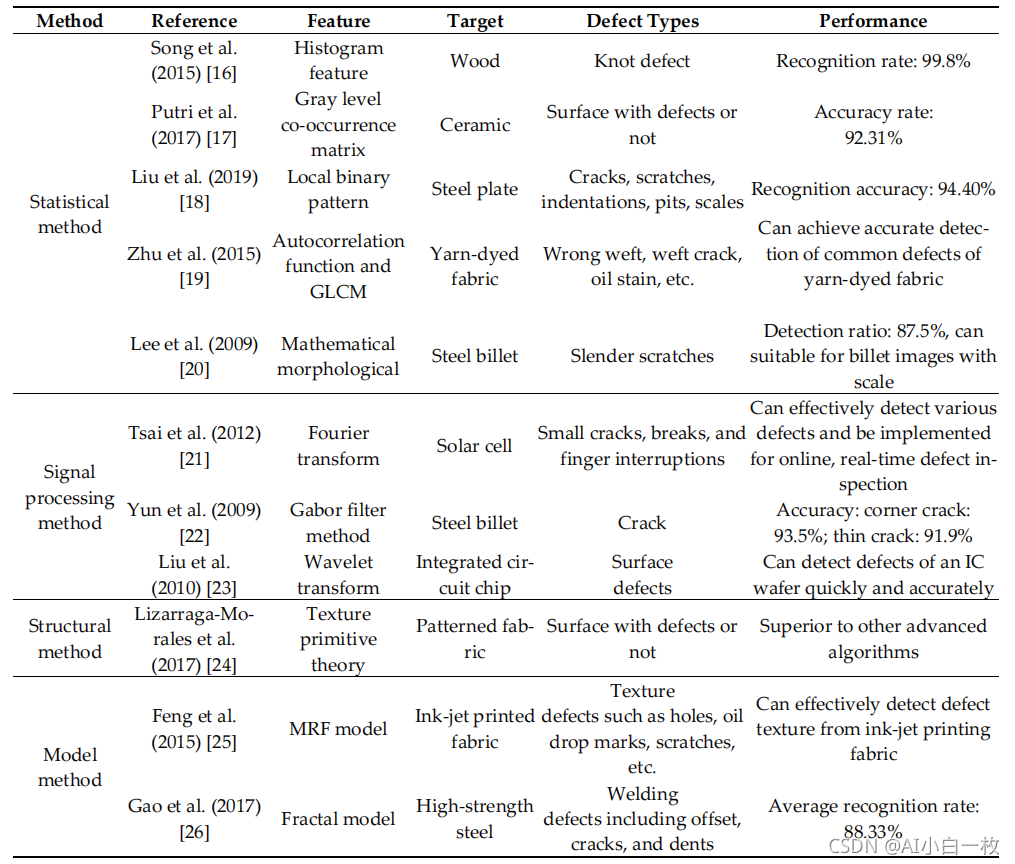 我们通过简要解释一些具体的研究方法来支持我们的观点,这是有效的。 考虑到文章的篇幅和可读性,我们只选取了一些研究方法进行扩展和解释,因此存在一些方法的文献不够或不最新的问题。 但是,我们相信我们的综述可以帮助研究人员了解工业产品表面缺陷检测的相关研究进展,并起到一定的参考作用。