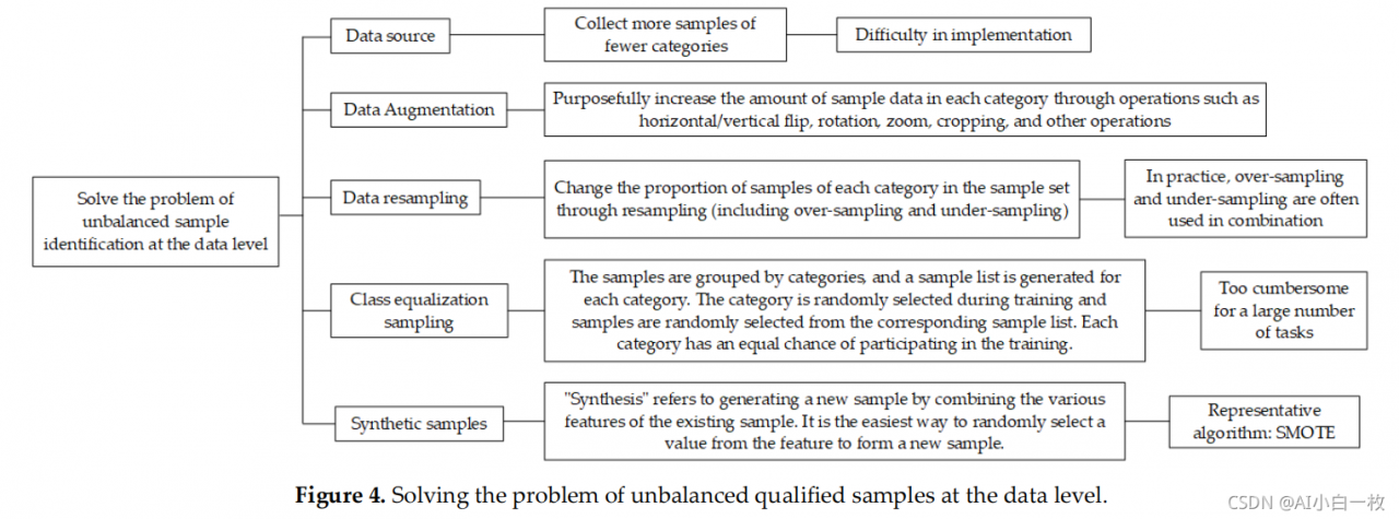 数据层面的处理方法思想是改变训练集的样本分布,使训练集中的样本分布趋于平衡,即各类样本的数量趋于一致。 可以从数据源、数据增强、数据重采样[99,100]、类均衡采样、合成样本[101]五个方面进行,如图4所示。