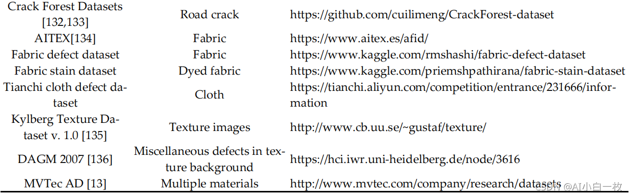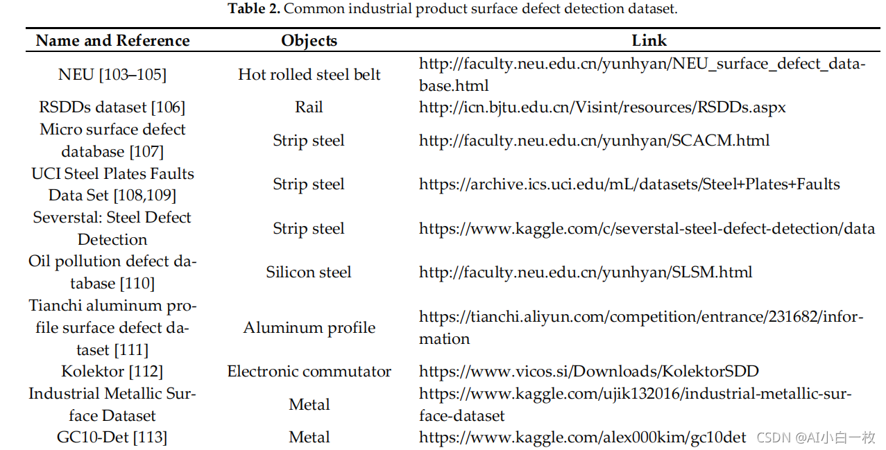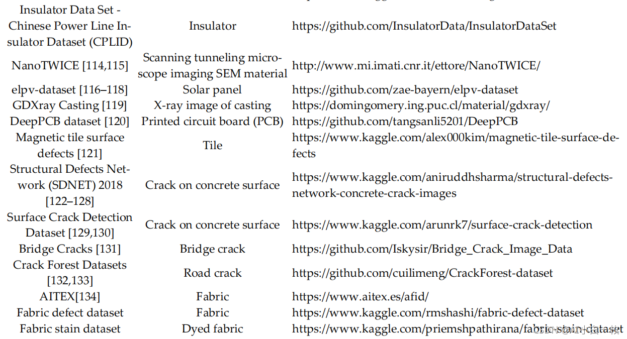 数据集是研究工作的基础。 一个好的数据集更有利于问题的发现和总结,从而便于解决。 目前,工业产品表面缺陷检测领域还没有一个庞大而统一的数据集。 对于特定的研究对象和研究场景,经常使用不同的数据集。 本节根据对象和应用场景的不同,对工业领域常用的数据集进行分类,并给出相关链接。 如表 2 所示,这些数据集涵盖了广泛的工业应用,包括:热轧钢带、钢轨、电子换向器、太阳能电池板、印刷电路板、磁瓦、织物等。 鉴于现有数据集的总结,希望能为学者在该领域的研究提供相同的数据来源。 此外,图 5 选取了部分数据集并在一定程度上展示了它。