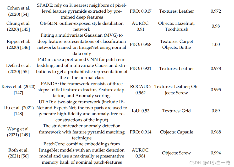 在无监督学习方法中,最常用的表面缺陷检测方法主要包括基于重建的方法和基于嵌入相似性的方法。对于前者,神经网络结构的训练仅用于正常训练图像的重建,异常图像由于不能很好地重建而容易被发现;异常分数通常用重建误差表示。最常见的基于重建的方法是自动编码器(AE)和生成对抗网络(GAN)。对于后者,深度神经网络用于提取描述整幅图像的有意义的向量,异常分数通常由测试图像的嵌入向量与训练数据集中表示正态性的参考向量之间的距离表示。典型的算法主要有SPADE[54]、PaDIM[55]、PatchCore[56]等。除了这两种类型之外,Deep Belief Network(DBN)和Self-Organizing Map(SOM)也可以用于表面缺陷检测.