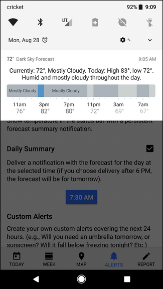 那里的大多数天气应用都会在恶劣天气临近时通知您,并且类似地,大多数应用会让您将温度数据添加到通知栏。 《黑暗的天空》将这两件事带到了一个新的高度。