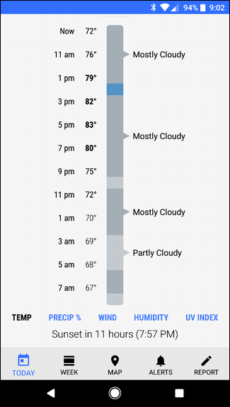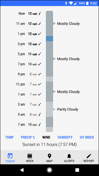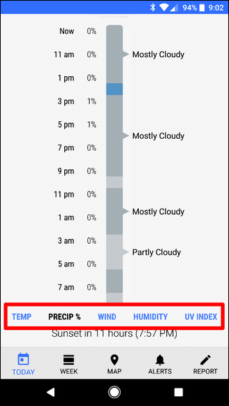 Just below the timeline you’ll see the other options: precipitation percentage, wind speed, humidity, and UV index. Tapping each option updates the details in the timeline with the relevant information.