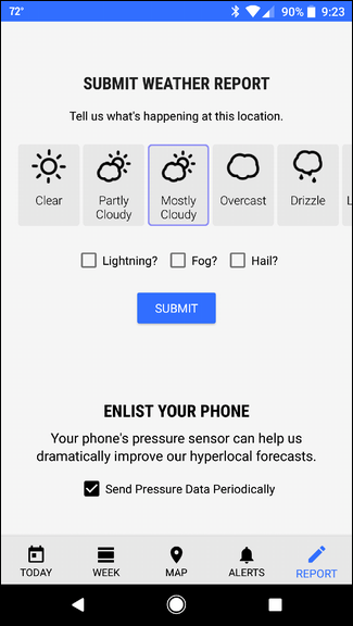 最后,还有“报告”选项。 基本上,这里是您可以报告本地情况的地方,这可以帮助Dark Sky使事情保持尽可能的准确。 您甚至可以允许手机的压力传感器将详细信息发送到Dark Sky,以帮助改善预测。 这很酷!