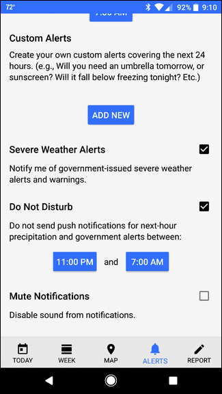 Down at the bottom of the interface is the navigation bar. This is where you can jump to the week view, radar map, and alerts. While most of those are pretty self explanatory, I do want to touch on Dark Sky’s alert system, because it’s actually awesome.