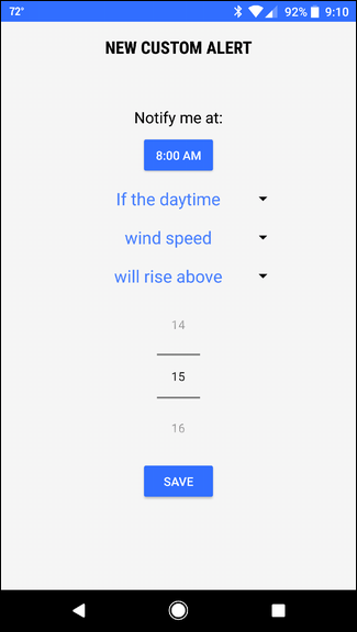 通知系统是可靠的,因为您可以让Dark Sky向您发送每日天气警报,其中包含当天(或第二天,如果通知设置为下午6:00)的详细信息。 您甚至可以设置自定义警报,以在遇到某些用户定义的变量时通知您。 例如,如果风速将超过每小时15英里,我会收到通知,在这一点上,我知道骑车会变得越来越困难,因为逆风会吸引人。 这是一个非常酷的系统。