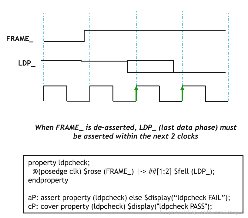 下面给出一个简单的例子。每当FRAME_无效(即变为高)时,最后数据相位(LDP_)必须被置位(即变为低)。这种检查对于纠正给定接口的功能是必不可少的。 SVA语言被精确设计来处理这种时域情况。正如我们将在Sect中看到的那样。 SVA建模比Verilog容易得多。还要注意,断言在时间域中起作用(我们将在后面介绍更多),并行以及多线程。这些属性使得SVA语言非常适合写时域检查。