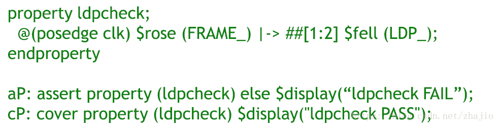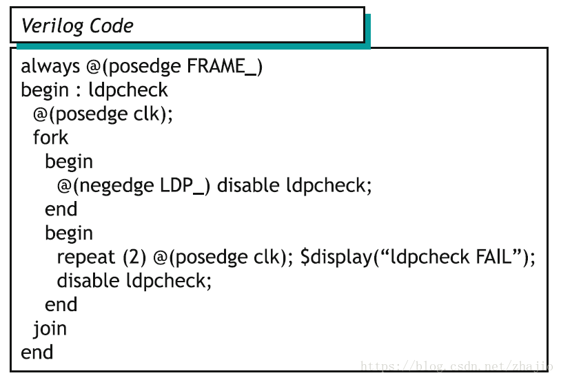 现在检查相同check的Verilog代码(图2.2)。有很多方法可以对此进行编码。显示了行为层面的一种方式。在这里你可以分解出两个程序块。一个监视LDP和另一个等待2个时钟。然后在两个程序块中的任何一个完成时禁用整个块('ldpcheck')。正如你所看到的,检查器不仅非常难以阅读/解释,而且很容易出错。您最终可能花费更多时间来调试您的检查程序,而不是验证逻辑。