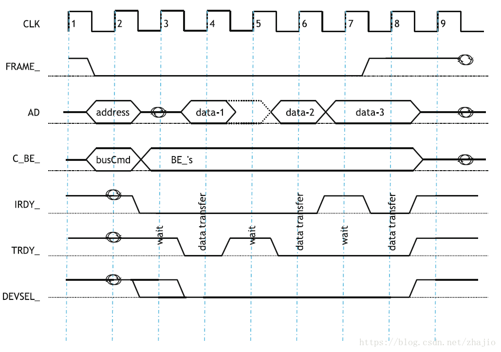 PCI协议用于简单的读取。使用FRAME_断言,AD地址和C_BE_具有有效值。然后IRDY_被断言,表示主机已准备好接收数据。目标以间歇等待状态传输数据。在FRAME_无效后,最后一次数据传输发生在一个时钟。
