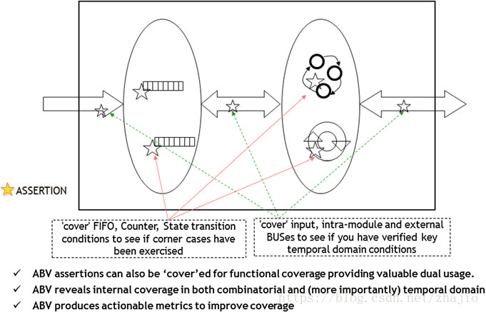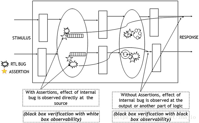 传统的验证可以称为Black Box验证,具有Black Box可观察性,这意味着,您可以在“模块”的主要输入处应用向量/事务,而不必关心模块中的内容(黑盒验证),并且通过主要输出观察模块的行为(黑盒可观测性)。另一方面,断言允许你进行黑盒验证时,用白盒进行观测(在模块内部写一些断言)。