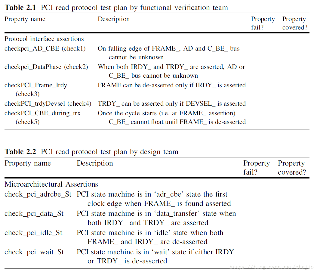 让我们考虑一下PCI Read的一个简单例子。根据图2.8的规范,设计团队会添加哪种类型的断言以及验证团队将添加什么类型断言?下表描述了这些差异。我只给出了几个可以写出来的断言。验证和设计工程师需要写更多的断言。但是,这个例子是作为区分的基础。
