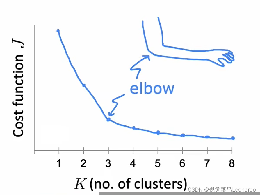 1.肘部法则:将代价函数视为簇数量的函数,看看是否有弯曲