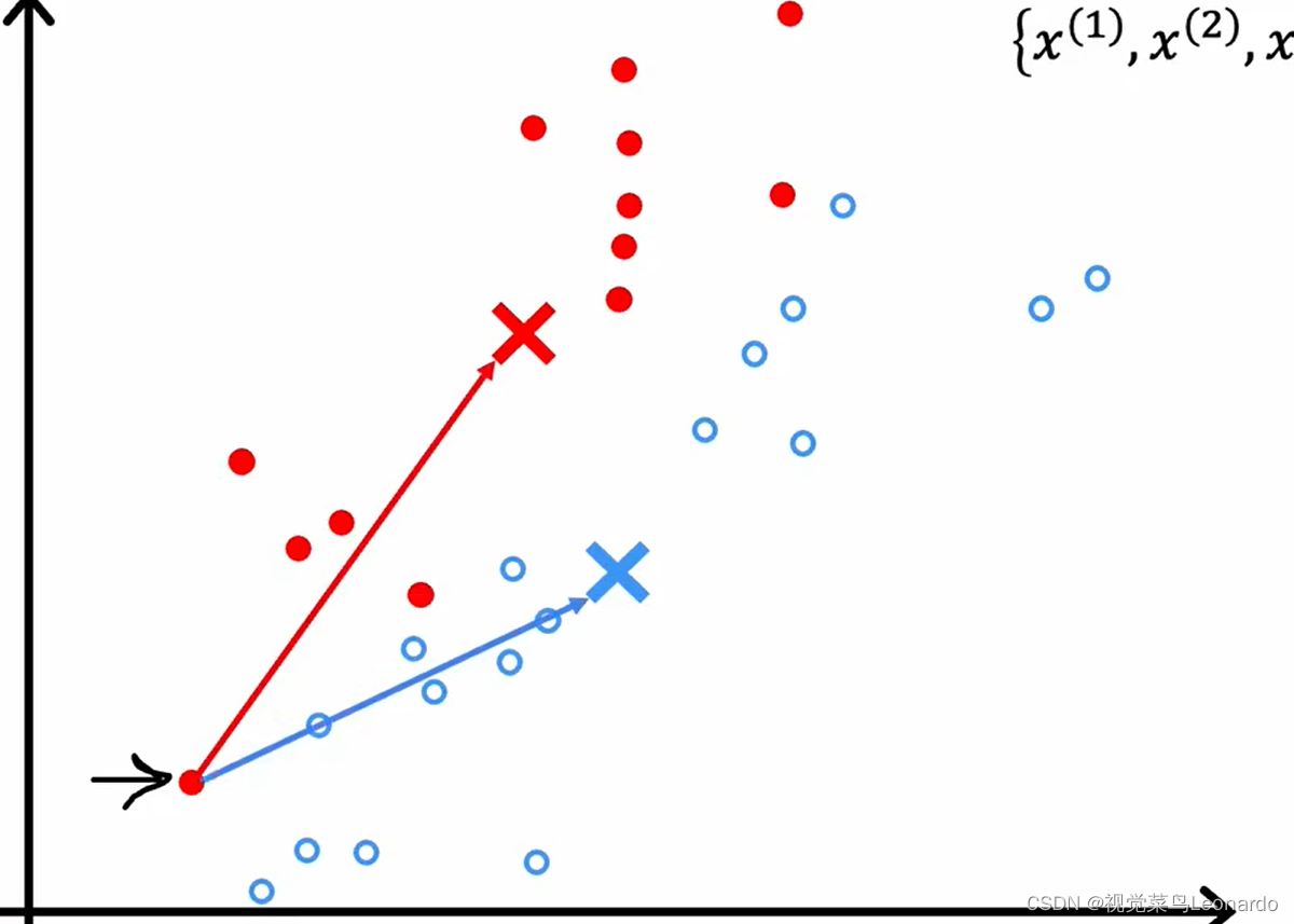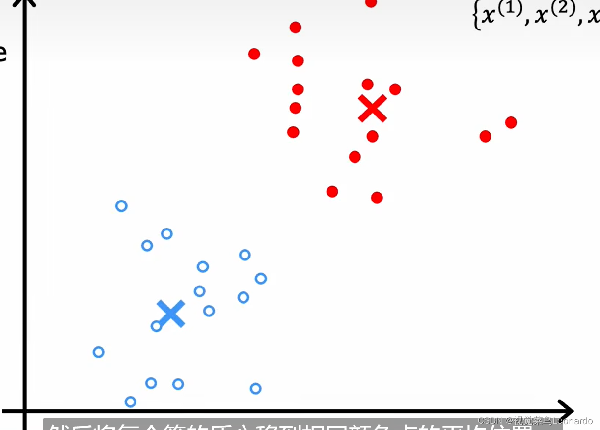 算法分为两步:第一步确定簇的质心,遍历所有样本,30个数据点,算法会判断数据点更接近于哪一个簇的中心点,并且自动分配;第二步,对于红点,所有的红点然后取平均值,将红叉移动到红点的平均位置,蓝色同理。