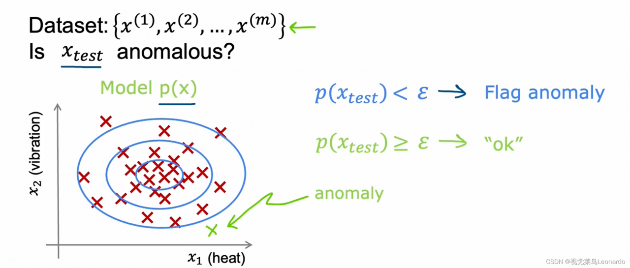 常见的异常检测方法为密度估计的技术,首先为样本x找到一个高概率事件和在数据集中不太可能遇到(概率小)的值。