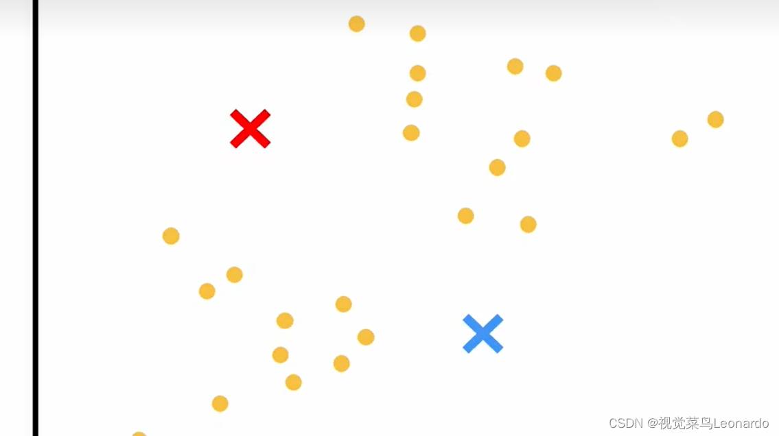 30个未标记的数据集,KMeans算法首先要估计两个簇的中心位置我,随机在图中画出: