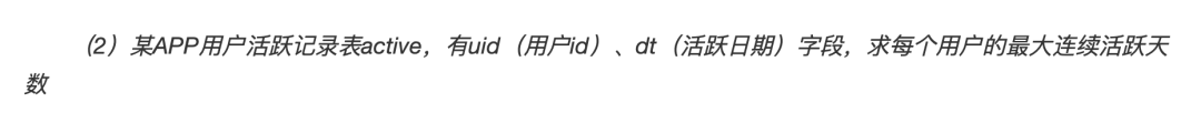 在上期的SQL题目中,我们以求连续活跃为例,讲述了lead 、lag错位相减的用法。但若不采用错位相减的话,其实也可以实现这一目的。本次我们就先讲述一下最大连续活跃天数的第二种解法,然后再讲述另一常见面试SQL题目。