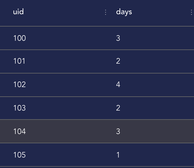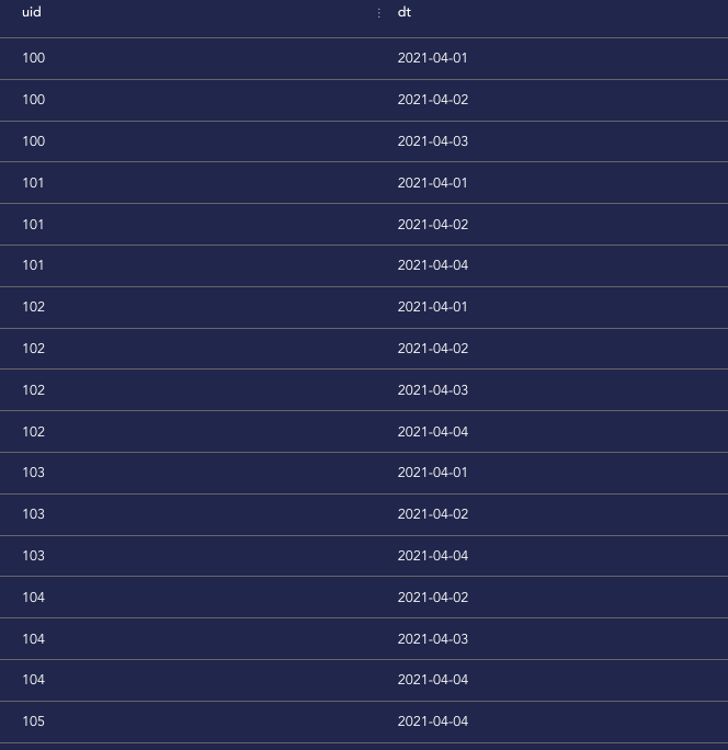 UNION ALL SELECT 103 UID,'2021-01-02' dt