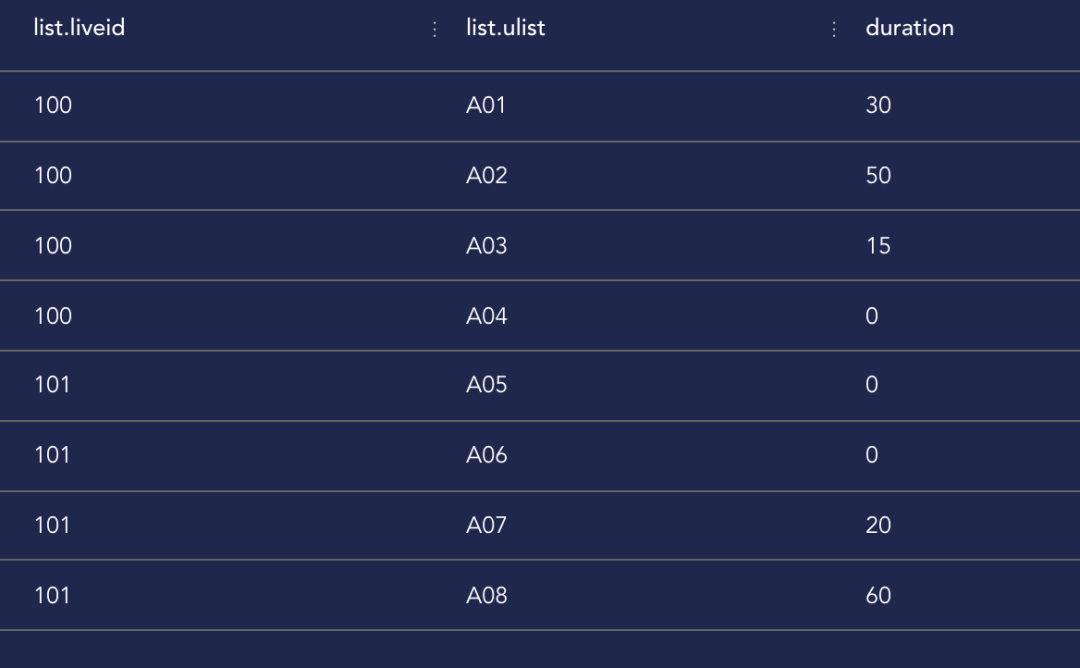 由于存在邀约用户未进房观看的问题,所以我们直接从观看记录中来取,不一定能将名单中所有用户包含进去,所以,我们需要以直播记录中的邀约名单为准。这就需要利用explode和lateral view来将这个string类型转换为行记录的形式。