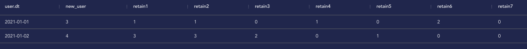 这种方法可能比较麻烦一些,得把要求的每一个留存指标都要单独写一个字段。若想省事儿,可以单独求出每日的新增数量,再将新增表与活跃表连接而求出每个注册日期在后续每天的活跃数量,然后将新增数量与活跃数量再进行关联,从而求得任意周期的留存。