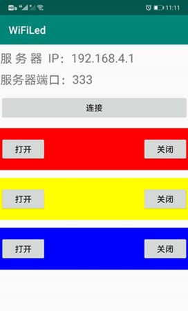 Android APP是借助Android Studio来开发的,界面比较简单,通过编辑框输入esp8266的IP地址和端口号,esp8266默认的IP地址是192.168.4.1,端口号是333,这些都可以通过AT指令进行修改。布局页面的xml代码我们就不贴了,熟悉Android开发的读者很快就能根据截图编写出来,放上一个APP界面的截图: