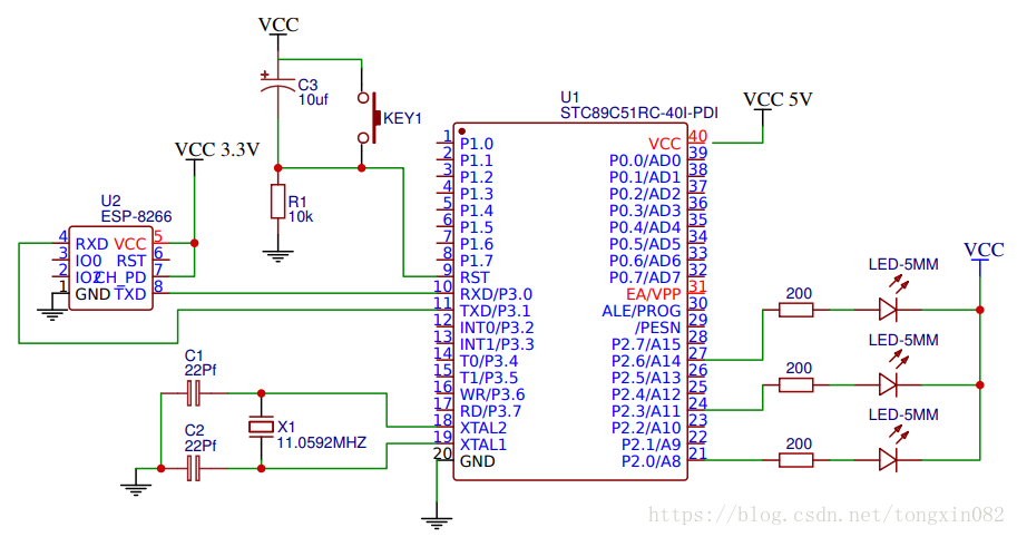 ESP8266模块作为一个透传模块使用,RXD、TXD分别连接51单片机的TXD和RXD,VCC和CH_PD管脚接3.3V电压,GND接地,只需要连接这些管脚,ESP8266模块就可以正常工作了。在单片机P2口上连接了三个5mm的LED灯,分别是红黄蓝三种颜色,我们的目的是通过手机APP上的开关控制着三个LED灯的亮灭。