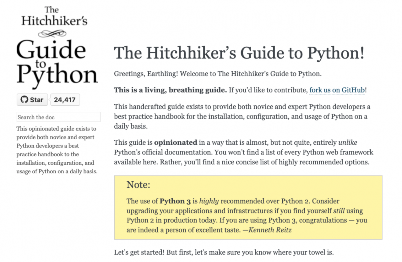 这是一份新手和进阶人员都可以读的教程,内容从安装,虚拟环境搭建开始讲起,然后介绍 Python 最佳实践和实战,比如如何构建项目,网络开发,Web 开发等。