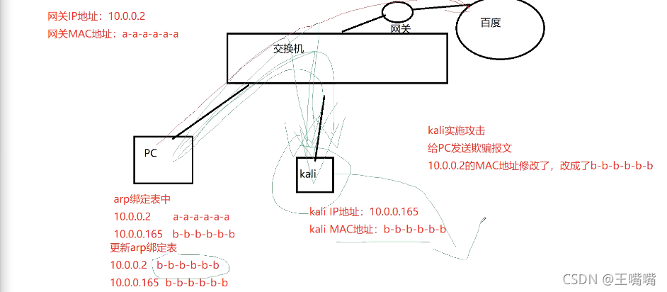 PC想将数据通过网关发送给百度,PC是发送方,kali作为攻击方,开始的时候arp绑定表一切正常,kali实施攻击之后,给PC发送欺骗报文,网关的MAC地址被修改了,被修改成了b-b-b-b-b-b-,也就是被修改成了kali的MAC地址,arp协议是一个单纯的协议,它相信了,更新了arp绑定表,数据还会发给网关嘛?当然不会,其实是把数据丢给kali,并不是发给网关。kali可以把你的数据扔掉,导致PC上不了网。这就是所谓的ARP欺骗攻击。